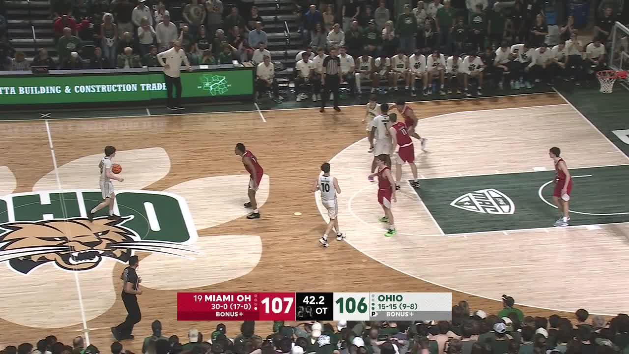 No. 19 Miami (Ohio) caps a 31-0 regular season with a 110-108 overtime win at Ohio. Miami (Ohio) finished the regular season as the only unbeaten team in Division I men's basketball, with Eian Elmer scoring a career-high 32 points and grabbing 12 rebounds in a gritty 110-108 overtime victory over Ohio on Friday night.